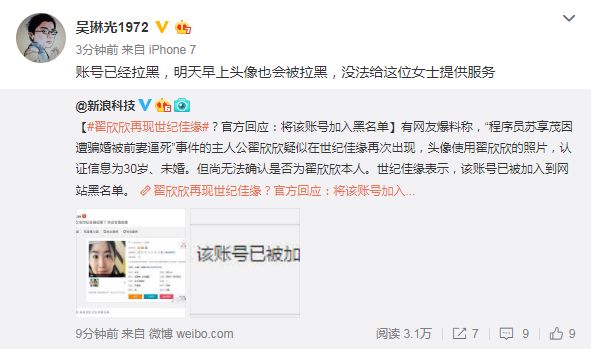 @新浪科技【翟欣欣再现世纪佳缘?CEO:已拉黑,不会给其提供服务】6月4日,网友爆料称,“程序员苏享茂因遭骗婚被前妻逼死”事件的主人公翟欣欣疑似在世纪佳缘再次出现,头像使用的翟欣欣的照片,认证信息为30岁、未婚、来自美国家里福尼亚。对此,百合佳缘CEO吴琳光在微博回应称,账号已经拉黑,明天早上头像也会被拉黑,没法给这位女士提供服务。世纪佳缘客服也表示,该账号已被加入到网站黑名单。