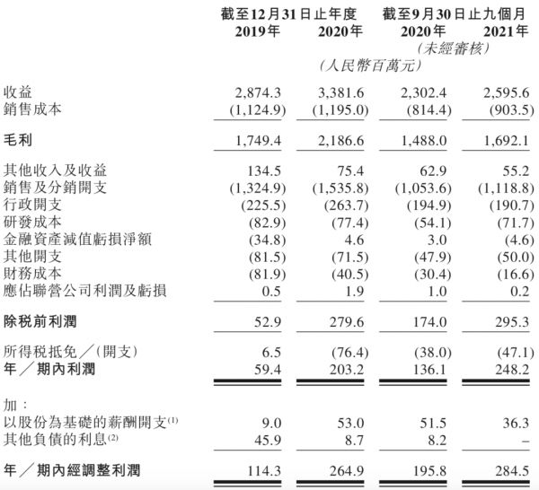 招股书显示,上美集团2019年至2021年前三季度的营收分别为28.74亿元、33.81亿元和25.96亿元。由于营销吞噬了大部分利润,同期的经调整利润分别为1.14亿元、2.65亿元和2.85亿元。