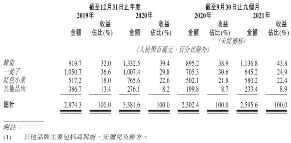 在2019年到2021年前三季度,这三个品牌贡献了上美近九成的收入。其中,韩束更是从2020年开始,以一己之力扛起了四成左右的收入。