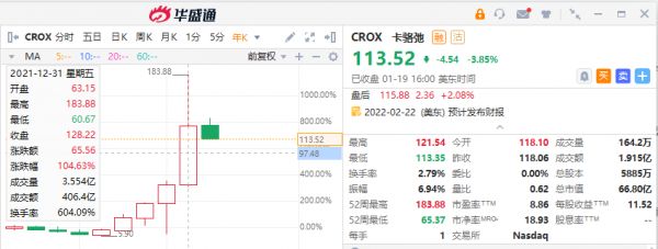 引起编者注意的是,去年它的股票表现很优异,年涨幅达104%,甚至好过比特币。在2017-2021的5年间,卡洛驰 $CROX 更是录得令人咂舌的超1700%涨幅。