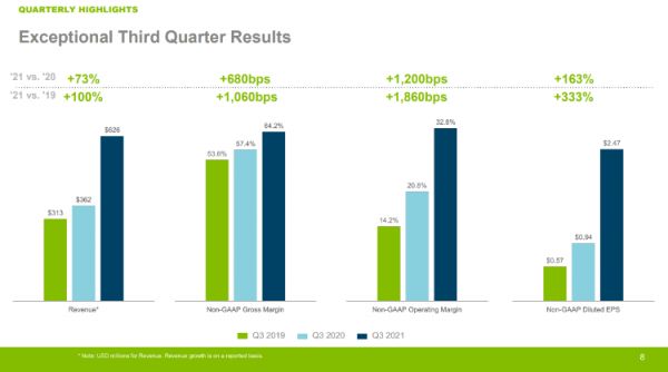 查阅往期财报得知,最近的四个季度,卡洛驰 $CROX 营收均录得了50%以上的同比增长。以21年Q3为例,该公司去年10月宣布Q3营收达到了6.26亿美元,同比增长73%;Non-GAAP毛利率达64%,Non-GAAP营业利润率达32%。