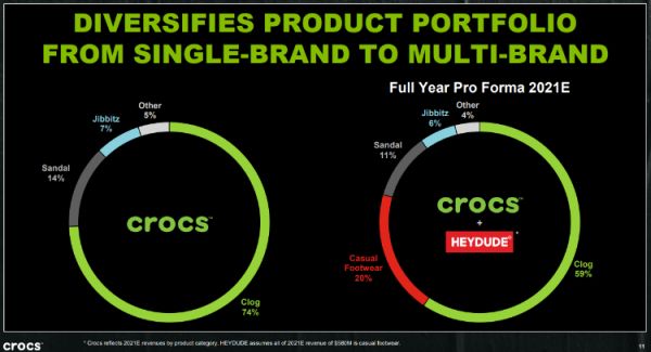 据该公司今年1月10日发布的年报预告,HeyDude的加入会立即提高卡洛驰的营收增长、利润率以及利润。而且,卡洛驰的收入来源也会因此变得更加多样化,对“洞洞鞋”的依赖会有所下降——该类产品在卡洛驰2021年营收中预计将占比74%,如果算上HeyDude的营收,这一数字预计将下降到59%。
