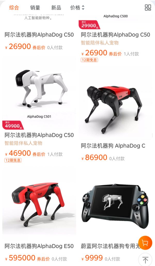 同时,在国内头部企业中,只有杭州宇树科技有限公司、南京蔚蓝智能科技有限公司的官方旗舰店有机械狗售卖,价格在1.6-59.5万元之间,在某电商平台上后者月销量是2台,宇树科技月销量则大约为30台。