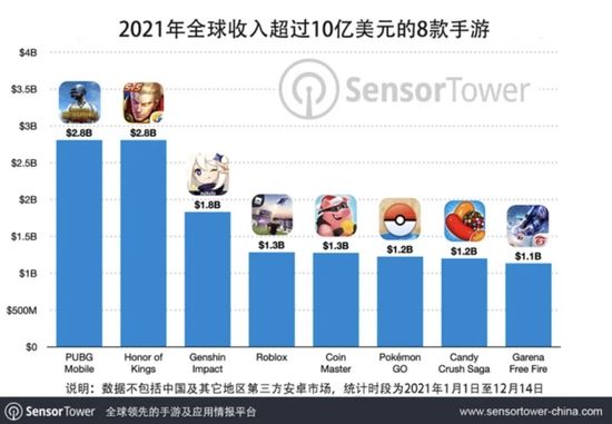 Sensor Tower数据还显示,以腾讯的《PUBG Mobile》、《王者荣耀》以及米哈游《原神》为首的8款手游,2021年在全球苹果商城和谷歌商城都获得了超过10亿美元的内购收入。