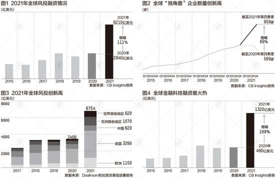 尽管统计方式不同,但多家分析机构均得出了较为一致的结论:2021年全球风投融资再创纪录。风投数据库CB Insights最新发布的报告显示,2021年全球风投融资达6210亿美元,较2020年的2940亿美元增长逾一倍;调研机构Dealroom和伦敦发展促进署(L&P)的最新报告也显示,2021年初创企业获得的总融资达到史无前例的6750亿美元,相比2020年翻了一番。