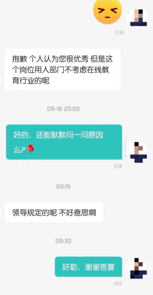 在求职过程中,他最常听到的几句话就是——“不好意思,不招在线教育行业的人”,“这一岗位和辅导老师不同,请慎重投递”。
