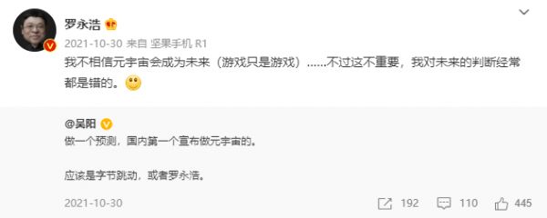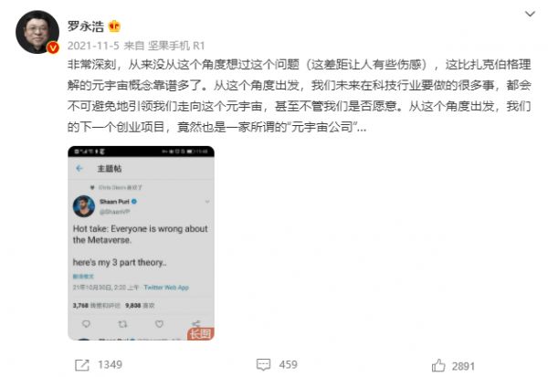 对此,最初老罗的态度是:“我不相信元宇宙会成为未来(游戏只是游戏)……不过这不重要,我对未来的判断经常都是错的”。有意思的是,在说完这句话的5天后,老罗又在微博上转发了一位推特主的推文,并且“自打脸”表示:“这样一看我的下一个项目,竟然也是一家所谓的‘元宇宙公司’。”
