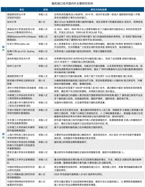 ▲脑机接口技术国内外主要研究机构来源: 《脑机接口技术在医疗健康领域应用白皮书(2021年)》
