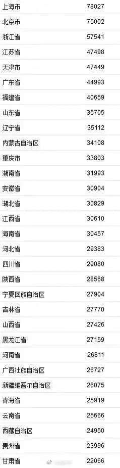 2021年居民收入榜出炉,上海北京人均可支配收入超7万元