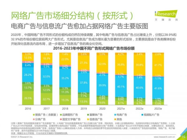 移动互联网的发展,让互联网广告从百度搜索广告的一家独大变成百花齐放。根据艾瑞咨询的数据,2015年以前,搜索广告都占据网络广告三分之一的份额。2016年起,搜索广告被电商广告反超,份额被压缩至五分之一,2018年起又被信息流广告反超,份额一路下滑至不足一成。