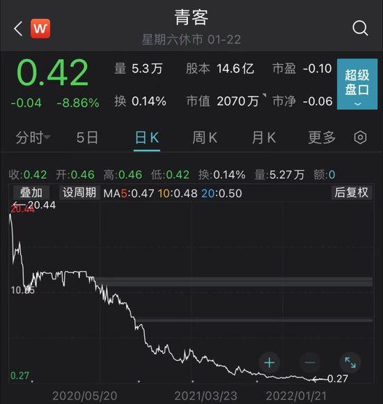 从股价表现来看,青客公寓自上市以来一直下跌,从最高点20.44元跌至1月22日的0.42元,跌去97.94%。公司最新市值也只有2070万美元。由于股价已长期低于1美元,青客还面临着从纳斯达克退市的风险。