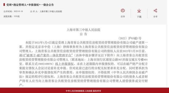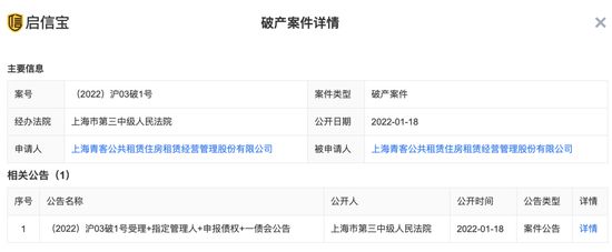 1月20日消息,上海市第三中级人民法院公告显示,已于1月4日裁定受理上海青客公共租赁住房租赁经营管理股份有限公司(以下简称“青客租房”)破产清算一案,债权人应在3月20日前进行线上申报债权。