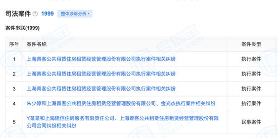 截至2022年1月21日,启信宝上统计与“上海青客公共租赁住房租赁经营管理股份有限公司”相关的司法案件已达1999条,多为金融借款合同、房屋租赁合同纠纷等。