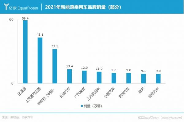 聚焦新能源乘用车领域,比亚迪、上汽通用五菱和特斯拉中国是全年新能源销量前三强,比亚迪以59.4万辆的销量,坐稳了中国新能源的第一把交椅。上汽通用五菱和特斯拉则分别以43.1万辆和32.1万辆,位列二三名。