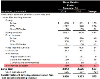 值得一提的是,贝莱德规模并不大的另类投资业务,也成为了重要的盈利增长点。2021年四季度,另类投资产品的管理费收入同比增长了37%,已占贝莱德总管理费收入的10%,而截至2021年末另类投资类产品仅占贝莱德10万亿美元的总AUM的2.6%。