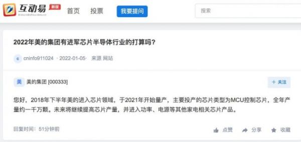 1月10日,美的通过深交所互动易平台宣布了造芯的消息:2018年下半年进入芯片领域,2021年已经量产约一千万颗。