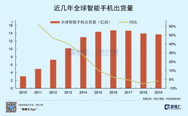 手机行业在4G技术替代3G时带来了新一轮的迅猛增长,但在全球用户渗透率足够高的近几年,销量增速已在不断下行,即使5G时代到来,也可能很难再现往年盛况。