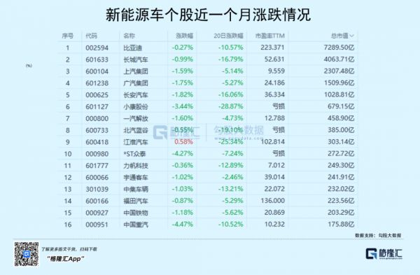 但即使如此,在最近一个多月来,这个无比高光的板块也开始跟着市场震荡回落,好几家汽车巨头都跌超了10%甚至更多。
