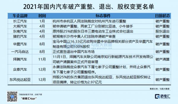 到现在,我们多在关注头部的几家造车势力高光时刻,却很少看到有大量的汽车品牌默默破产倒下,2021年国内汽车破产重整或退出的知名品牌超过10家,其中不乏众泰汽车、猎豹汽车、拜腾汽车等知名品牌。