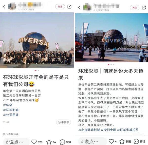 在线下,环球影城一日游,成了2021年下半年很多公司团建式年会的必选项。一些社交平台上,环球影城一日游团建早已刷屏,甚至有网友表示:“在北京的公司,还有没去过环球影城团建的嘛”。