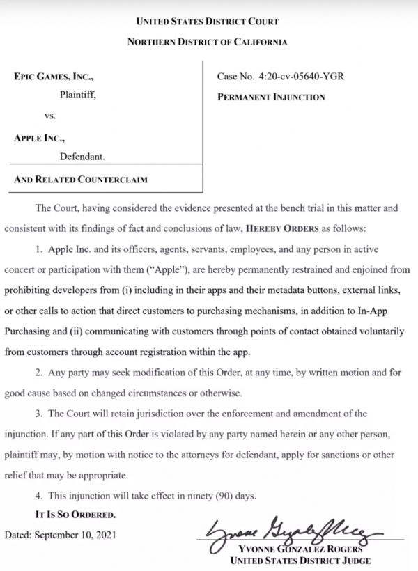 2021年9月,加州法院作出包括禁止苹果垄断应用商店支付渠道禁令在内的185页判决。当然,Epic也被打了五十大板,由于违法与苹果的开发者协议,被要求向苹果支付365万美元的赔偿金。