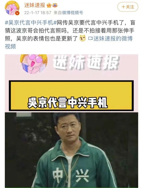 1月17日晚,中兴通讯高级副总裁、中兴通讯终端事业部总裁倪飞在微博晒出了一件印有“中国”二字的运动外套。随后,中兴官方微博转发并附文“寻衣服主人”。网友敏锐地发现,这件外套正是吴京热门表情包中的同款外套。同日,中兴终端举行的媒体沟通会上,倪飞宣布吴京成为中兴手机代言人。稍晚时候,众多娱乐博主和科技博主发布了#吴京代言中兴手机#话题博文,并将该话题送至微博的时事热点。