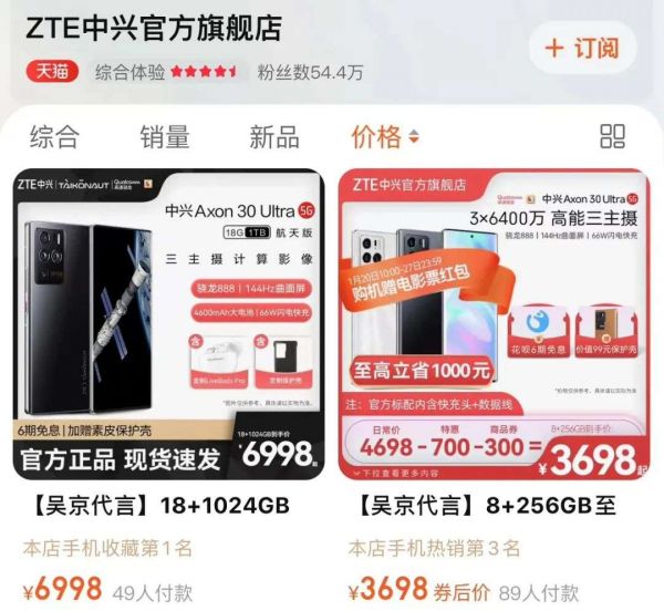 但中兴需要补的课还是太多,天猫官方旗舰店中,仅有属于Axon 30、S30和远航20这3个系列的8款手机。在中高端机型方面,目前业内对中高端机的判定标准不一,若以最低标准(定价3000元以上)来算,中兴目前只有两款中高端机型,即Axon 30 Ultra和Axon 30 Ultra航天版,前者不同内存版本的价格约在4000-4600元之间,后者价格则接近7000元。