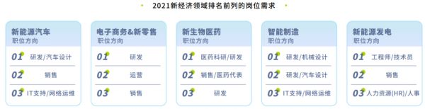 具体到岗位上,从脉脉研究数据看(图5),新经济领域包括新能源汽车和发电、电商/新零售、新生物医药以及智能制造,研发和技术人才需求量均排在首位。