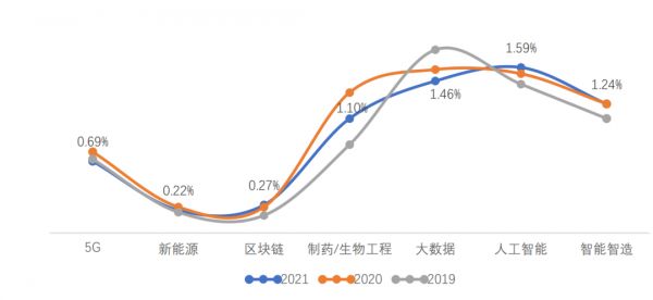 2021年重大战略新兴产业相关的行业竞争热度也持续维持高位(图4)。其中,人工智能、智能制造同比逐年提升。说明人才越来越关注重点技术领域发展。