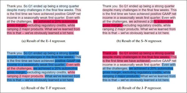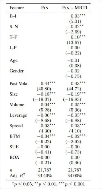 「在风险回归任务中,我们表明预测的 CEO 性格与股票收益波动形式的财务风险显著相关。定性地讲,外向、直觉和思考类型的 CEO ,投资其公司股票面临的经济风险较低。」