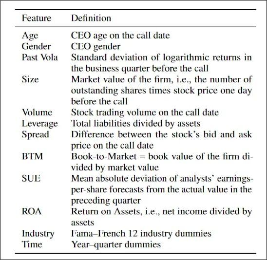 为了促进项目的风险回归,作者研究人员又将CEO的财报电话会议言论数据与来自 IBES、CRSP 和 Compustat Execucomp 的数据库进行了合并。