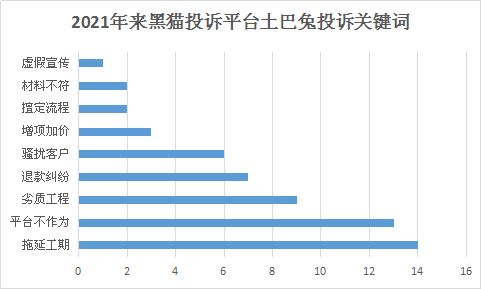 潇湘晨报记者此前整理出2021年1月以来黑猫投诉平台上所收到的齐家网、土巴兔消费者投诉的关键词。其中,“拖延工期”、“劣质工程”、“增项加价”、“材料不符”等均榜上有名。