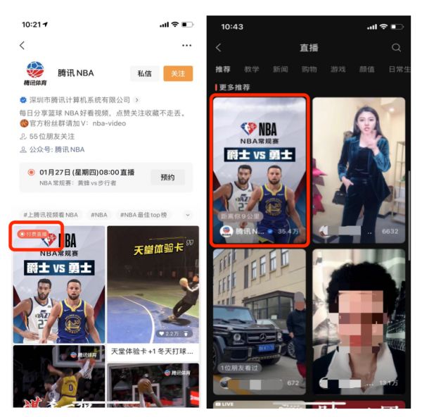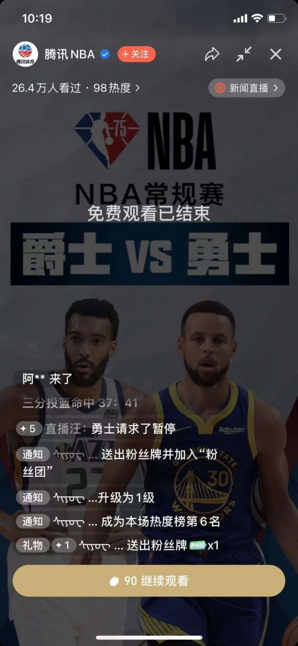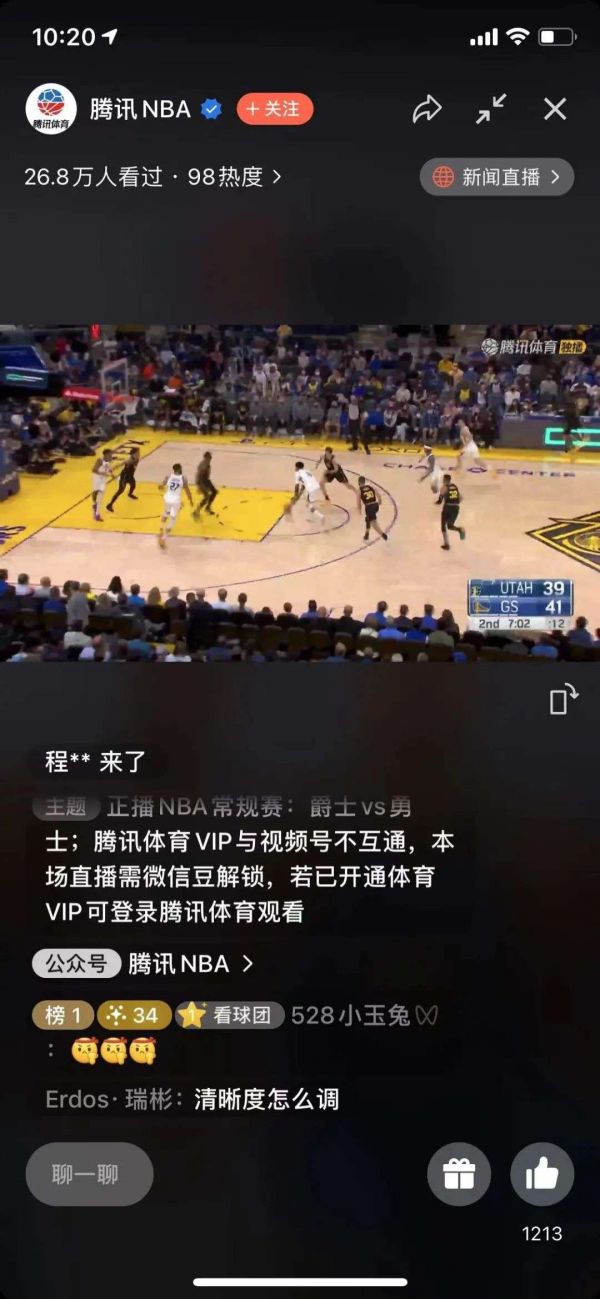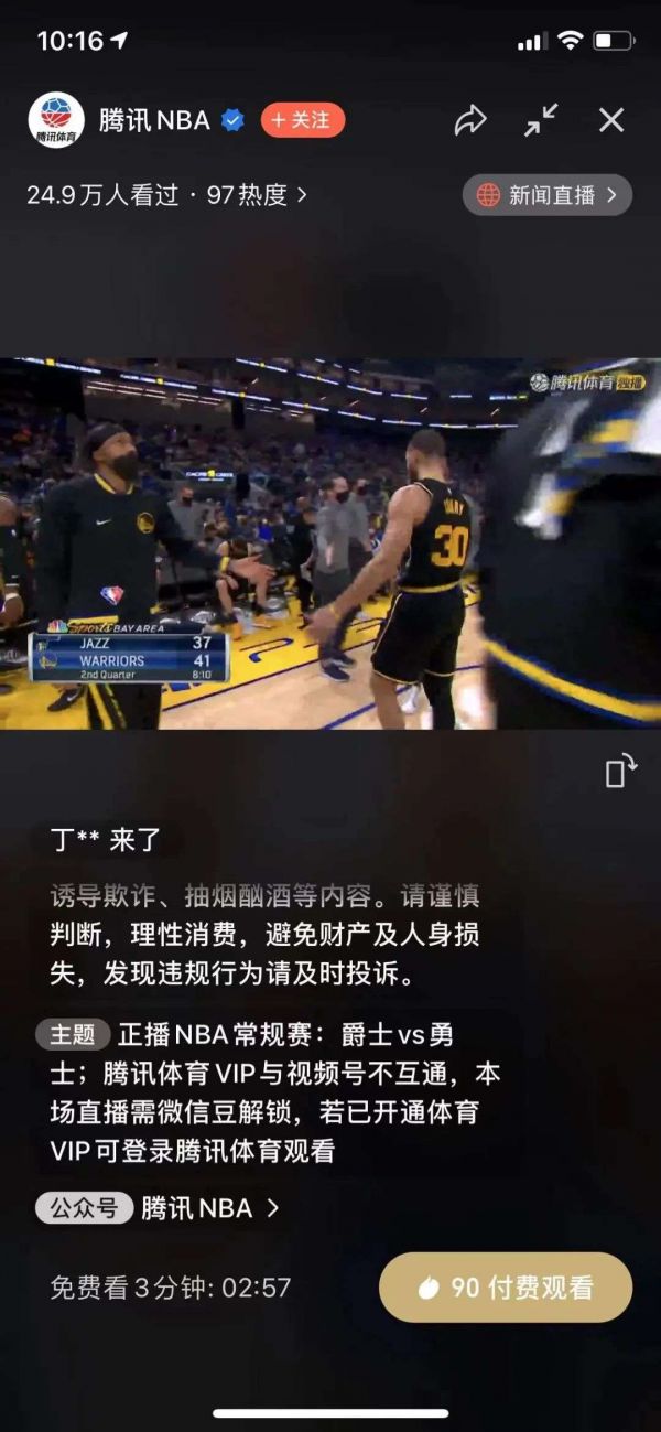 如果细看图片(下图),会发现视频号直播付费功能上线了。在腾讯NBA本场视频号直播间,用户只可免费观看3分钟,若想观看本场全程直播,则需要支付90个微信豆解锁。