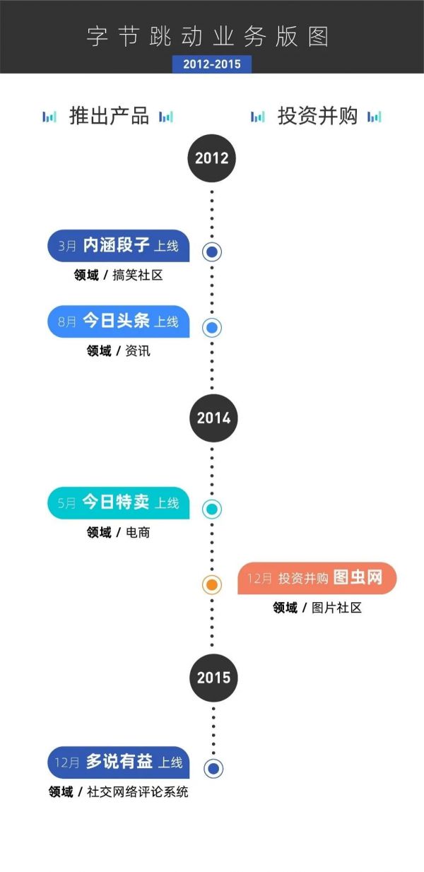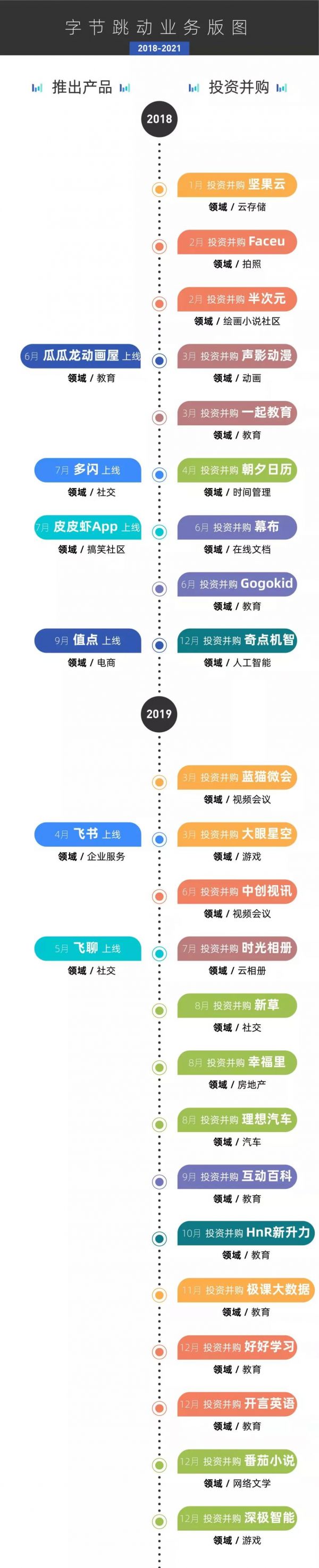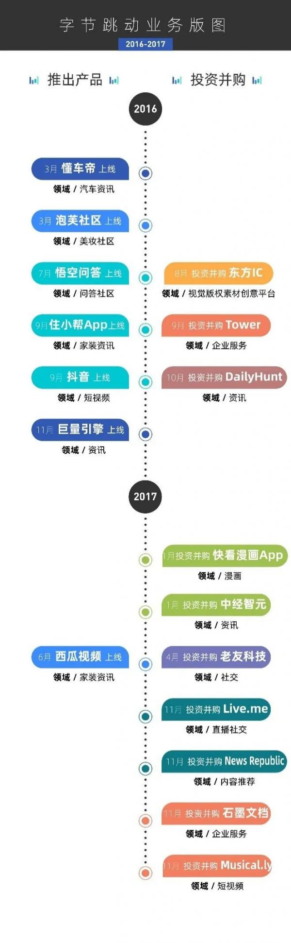 字节跳动被称为“APP工厂”,最初的扩张是在资讯领域,曾经有传言,今日头条上各个垂直频道,都要被分离出来做个APP,而对不太好涉及的领域,字节跳动就进行投资或者收购。比如,其先后投资了今日特卖、图虫网、30秒懂车、快看漫画、Tower等项目,2017年,字节跳动大刀阔斧地收购了全球移动新闻运营商News Republic和北美音乐短视频应用Musical.ly,Musical.ly创始人之一的朱骏就在公司被收购后加入字节跳动,并且一度领导战投部。随后字节跳动推出今日头条海外版TopBuzz、抖音海外版Tik Tok等产品,后者被称为中国互联网企业最优秀的出海产品,在海外市场的大获成功。