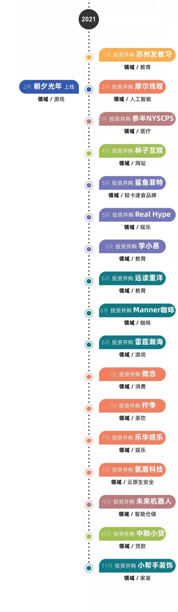 在互联网大公司中,频繁的投资并购并不少见。据媒体统计,2021 年,腾讯、小米、阿里巴巴、字节跳动、B站、百度、美团、京东 8 家企业参与投资超过 600 起,总投资金额超过 3500 亿元。而阿里巴巴和腾讯投资的企业,更是被冠以“阿里系”和“腾讯系”之名,几乎没有缺席互联网的每个角落。