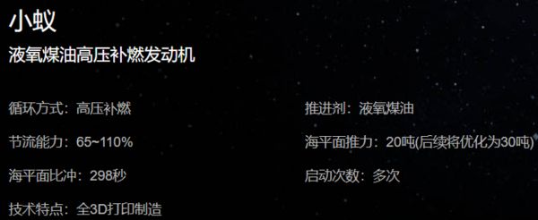 太瀚正在开发小蚁液体火箭发动机,以液态氧和煤油作为推进剂。使用高压补燃循环技术提高发动机性能,架构先进,性能指标高于商业航天普遍使用的燃气发生器循环技术,和国家队主力火箭发动机性能相当。该款发动机V1目前推力为海平面20吨,正式投入使用时V2版优化为30吨,并计划在下一代巨蚁发动机将海平面推力提升至200吨。