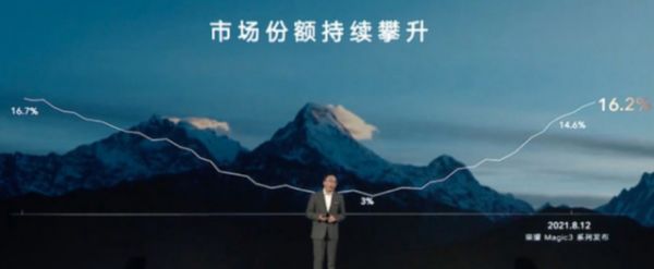 不过,到了下半年,随着荣耀新机的发布,荣耀国内市场又奇迹般地实现“V”型转机,2021年8月底,荣耀国内市占率达到16.2%,接近历史最高水平,来到了国内三强之列。