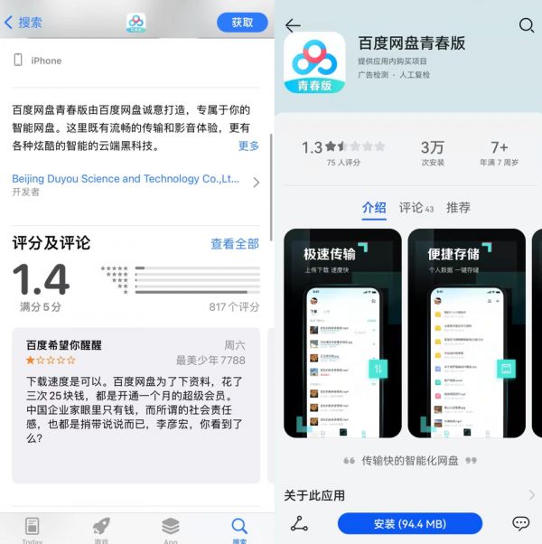 去年11月,工信部就网盘限速问题约谈8家主要企业。此后不久,主打“不限速”的百度网盘青春版(以下简称“青春版”)在2021年的最后一周上线。截至1月18日,青春版在华为应用商店、苹果App Store得到的用户评分,均为1.4分(满分5分)。