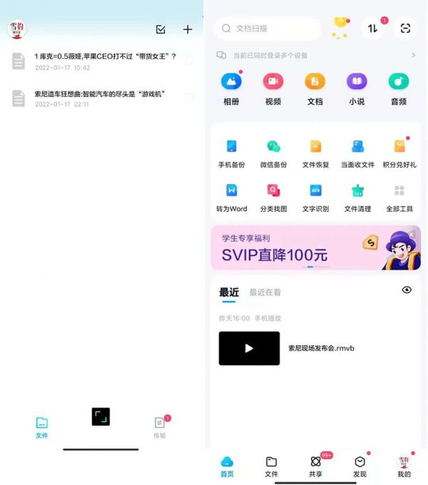 在外观上看,青春版更像是主盘的“极简版”。打开青春版,首页十分清爽,底部分别设有文件、传输两个功能的一级入口,以及扫描文件入口。点击“文件”,会显示导入过的文件名称;点击扫描文件入口,可使用文档扫描和文字识别两个功能;点击“传输”,则显示正在下载或者上传的文件。