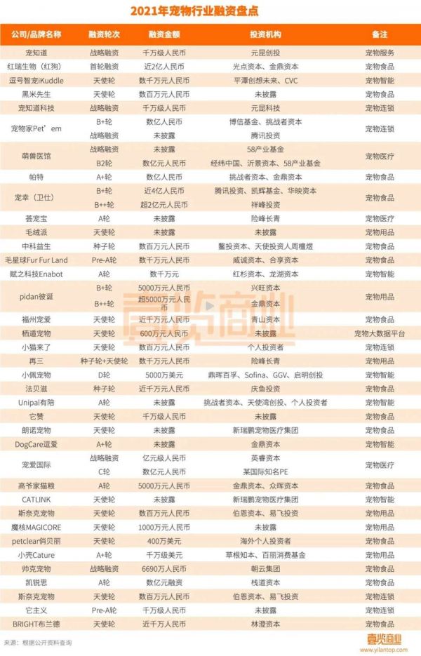 随着国内养宠已经进入到精细化、老龄化阶段,在宠物食品、宠物用品、宠物医疗等关键领域都大受资本追捧。