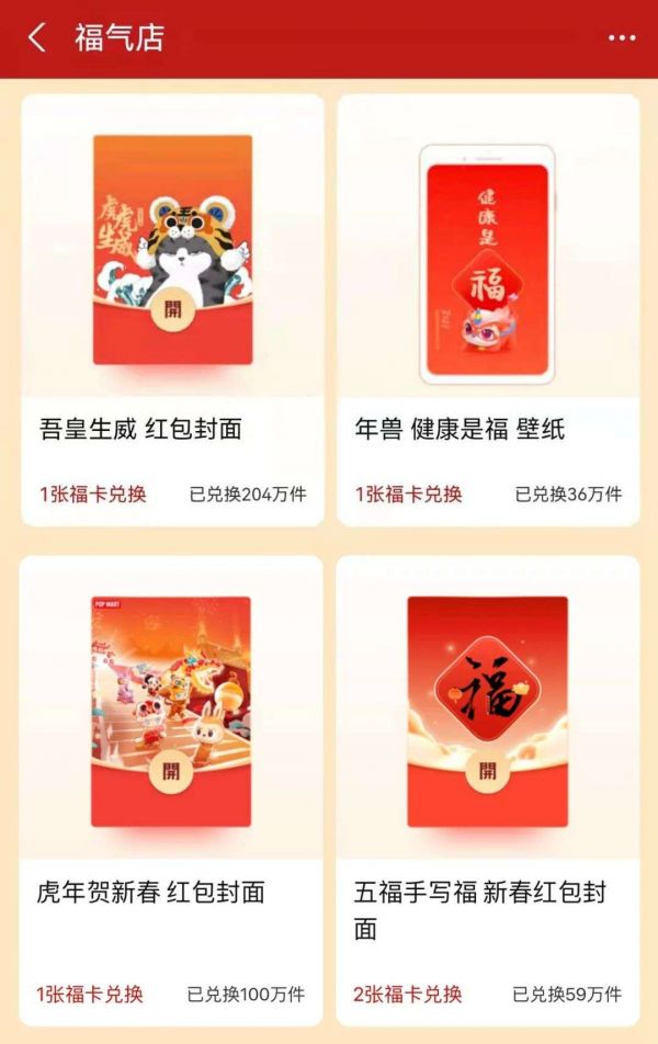 支付宝则将已经连续玩了七年的“集五福”活动与红包封面功能打通,用户可以用福卡换取喜欢的红包封面,封面设计不同,所需福卡的数量也不一样。