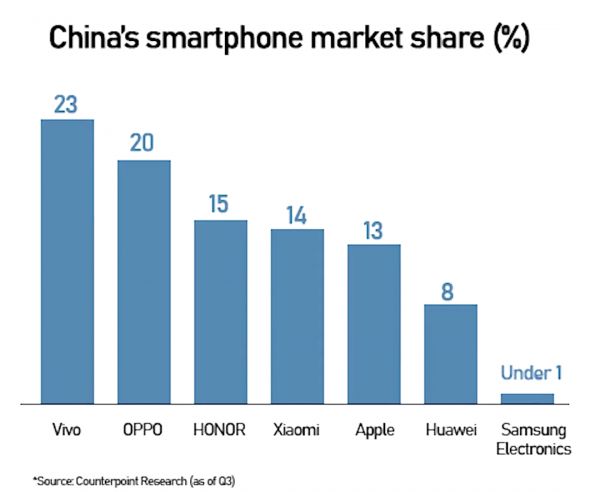 在中国市场,巅峰时期的三星市场份额占比曾超过20%。