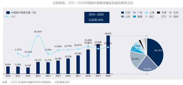 中国市场对碳纤维需求量更高,2018年到2020年的增长率更是远超以往,并刺激上游大规模扩产: