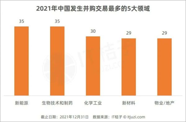 据 IT 桔子统计,2021 年中国新经济领域并购最为活跃的是新能源领域和生物技术和制药领域,均发生并购事件 35 起,新能源领域被并购公司涉及新能源开发、风能、热力供应、锂电池、光伏发电等业务。