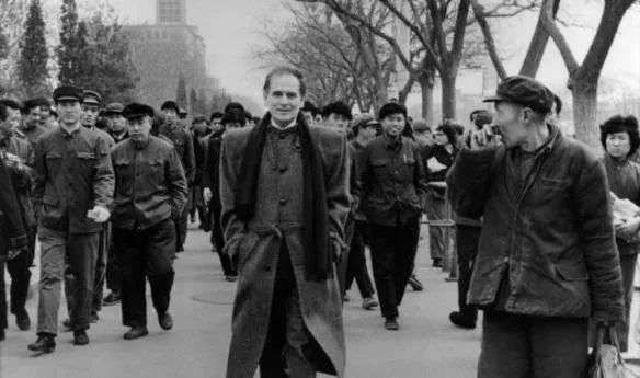 比如1978年12月,皮尔卡丹穿着长款羊毛大衣双手插兜走在北京街头,时髦的衣着款式以及宽垫肩设计,在彼时还穿着清一色中山装的人群里显得格外醒目。