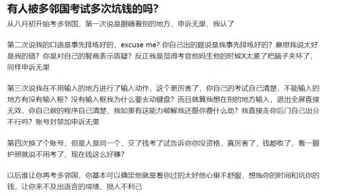 知乎上总结考试注意事项,诸如尽量练习盲打、注意机打的空格问题、确保浏览器没有插件与弹窗、切换输入法等条条框框的限制让不少人直呼头疼,而略有模板痕迹的写作部分与不流畅的口语部分、未作答不计分题也会立刻导致认证不成功,欲哭无泪的部分考生表示,在家考哪有在考场自由。