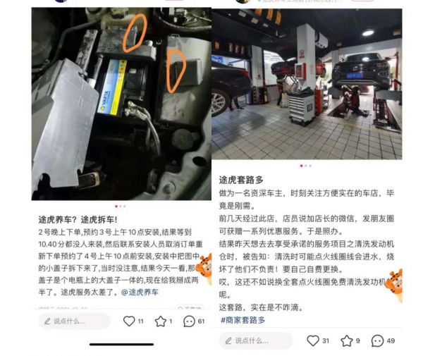 另一方面,也有用户吐槽途虎养车是“途虎拆车”,换换轮胎、简单保养还可以,机械拆件等修车业务的体验糟糕。