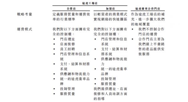 从招股书上看,途虎养车的门店有三种运营模式,分别是途虎养车自营工场店、加盟工场店和合作门店。