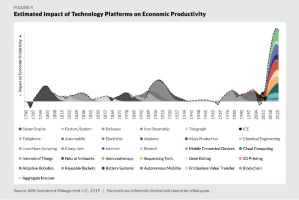 下面的图表描绘了过去250年的主要技术突破及其经济影响。我喜欢这幅图,因为它真的捕捉到了这一刻是多么独特。它看起来就像一股浪潮向我们袭来,从很多方面来看,确实如此。