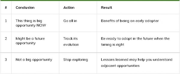 何时探索新机会:成功的技术在成为主流之前要经历几个阶段:想法、资金、概念验证、指数增长和主流应用。每经过一个阶段,这个想法成为主流的可能性都会增加。能到指数增长阶段的新事物相对少见,它代表了真正的用户吸引力。把这个阶段变成一个过滤器,可以帮助你避免浪费时间去探索每一个新的技术突破和产品公告。实际上,大多数的新技术和产品公告永远不会变成有价值的东西。
